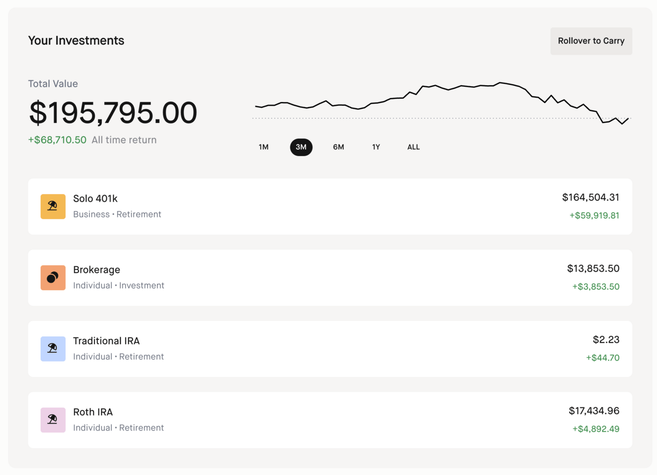 My long term goal is to emulate what Peter Thiel was able to accomplish with his $5B Roth IRA. My strategy is use my Solo 401k to get a lot of dollars into a Roth IRA, and then use the Roth to take the occasional bet on assets with asymmetric upside. No other platform will allow me to do this as elegantly as Carry.